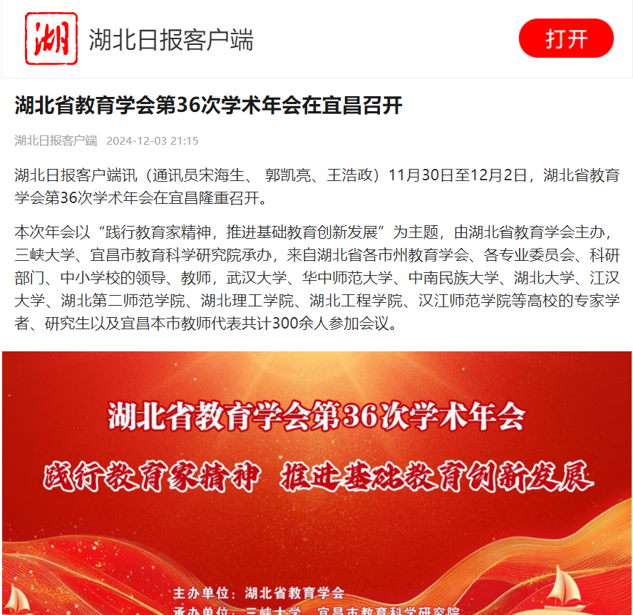 湖北日报客户端讯(通讯员宋海生、 郭凯亮、王浩政) 11月30日至12月2日,湖北省教育学会第36次学术年会在宜昌隆重召开。