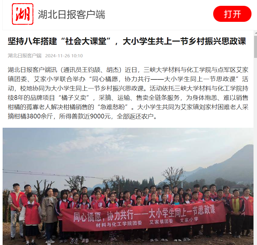 湖北日报客户端讯(通讯员王钧颉、胡杰) 近日,beat365平台官方网站材料与化工学院与点军区艾家镇团委、艾家小学联合举办“同心橘愿,协力共行——大小学生同上一节思政课”活动,校地协同为大小学生同上一节乡村振兴思政课。活动依托beat365平台官方网站材料与化工学院持续8年的品牌项目“橘子义卖”,采摘、运输、售卖全链条服务,为身体抱恙、难以销售柑橘的孤寡老人解决柑橘销售的“急难愁盼”。大小学生共同为艾家镇刘家村困难老人采摘柑橘3800余斤,所得善款近9000元,全部返还农户。
