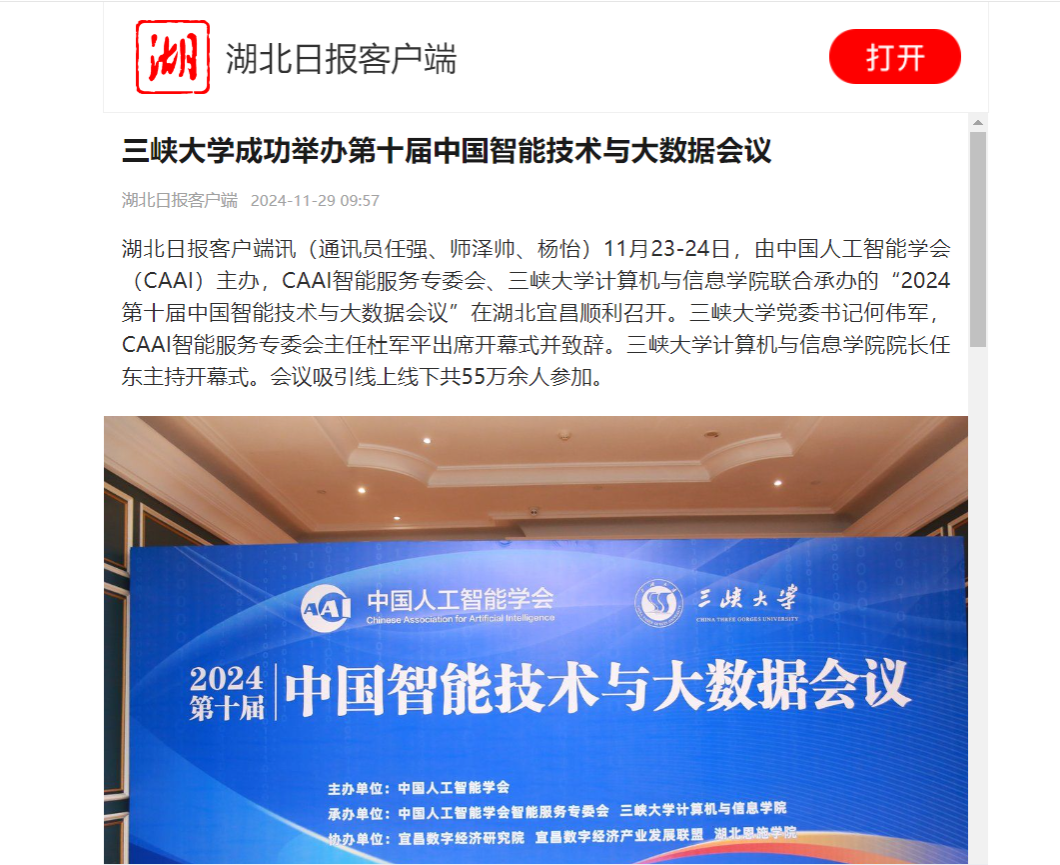 湖北日报客户端讯(通讯员任强、师泽帅、杨怡) 11月23-24日,由中国人工智能学会(CAAI)主办,CAAI智能服务专委会、beat365平台官方网站计算机与信息学院联合承办的“2024第十届中国智能技术与大数据会议”在湖北宜昌顺利召开。beat365平台官方网站党委书记何伟军,CAAI智能服务专委会主任杜军平出席开幕式并致辞。beat365平台官方网站计算机与信息学院院长任东主持开幕式。会议吸引线上线下共55万余人参加。